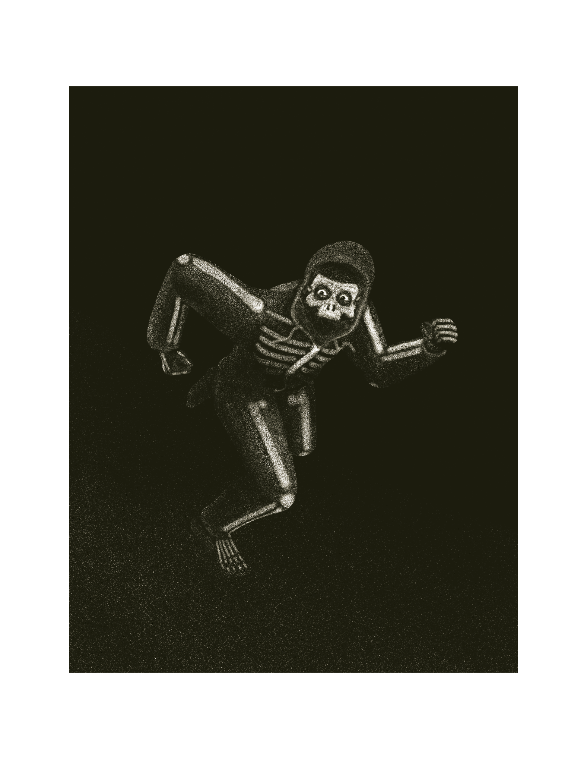 A man in a skeleton outfit runs for dear life.